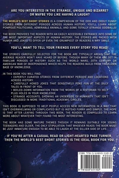 Do you want to be entertained by strange, unique and interesting true stories? Or maybe just have a laugh? The World's Best Short Stories is a compendium of crazy and oddly funny stories from different periods across human history. You'll learn about pompous politicians, admirable animals, and some very strange oddballs! The book provides the reader with an easily accessible entrance into some of the most important aspects of human history. The stories are packed with humor and jokes to offer up even the grumpiest of readers a wry smile. The stories carefully selected for the book are typically areas that the average reader won't have heard of before. Though many of them are set in familiar periods of history which helps the readers build from their own base of knowledge. In this book you will find: ¿ 127 exciting stories from different periods and locations across history.¿ Boiled-down information from the words of a historian to help plug holes in your knowledge. ¿ Strange accounts, showing an underside of humanity that isn't discussed in more traditional academic circles.· A little extra touch of wit and humor, to keep you entertained along the way. This book is supposed to help people access new information in a way that isn't overwhelming or complicated but is instead funny and simple. The book has some mature themes, though it remains suitable for young teenagers and older, as long as whoever reads the book is just immature enough to be able to laugh at the sillier side of life and history. If you're looking for the perfect gift item or just a casual read or light-hearted page-turner, then The World's Best Short Stories is the book for you.