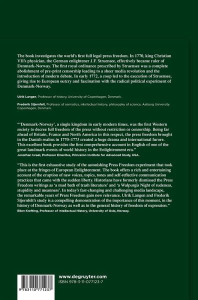 "'Denmark-Norway', a single kingdom in early modern times, was the first Western society to decree full freedom of the press without restriction or censorship. Being far ahead of Britain, France and North America in this respect, the press freedom brought in the Danish realms in 1770-73 created a huge drama and international furore. This excellent book provides the first comprehensive account in English of one of the great landmark events of world history in the Enlightenment era." - Jonathan Israel, Professor Emeritus, Princeton Institute for Advanced Study