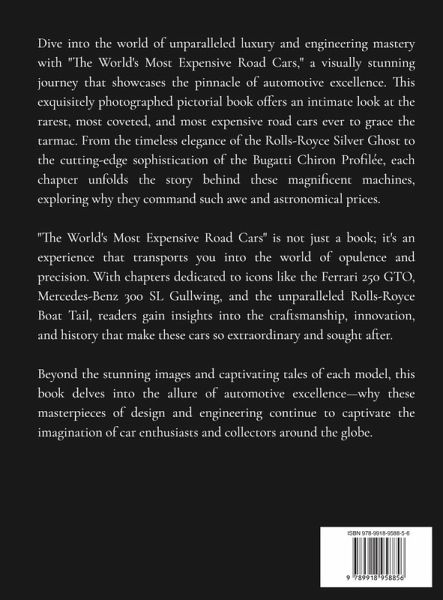Dive into the world of unparalleled luxury and engineering mastery with "The World's Most Expensive Road Cars," a visually stunning journey that showcases the pinnacle of automotive excellence. This exquisitely photographed pictorial book offers an intimate look at the rarest, most coveted, and most expensive road cars ever to grace the tarmac. From the timeless elegance of the Rolls-Royce Silver Ghost to the cutting-edge sophistication of the Bugatti Chiron Profilée, each chapter unfolds the story behind these magnificent machines, exploring why they command such awe and astronomical prices. "The World's Most Expensive Road Cars" is not just a book; it's an experience that transports you into the world of opulence and precision. With chapters dedicated to icons like the Ferrari 250 GTO, Mercedes-Benz 300 SL Gullwing, and the unparalleled Rolls-Royce Boat Tail, readers gain insights into the craftsmanship, innovation, and history that make these cars so extraordinary and sought after. Beyond the stunning images and captivating tales of each model, this book delves into the allure of automotive excellence-why these masterpieces of design and engineering continue to captivate the imagination of car enthusiasts and collectors around the globe.
