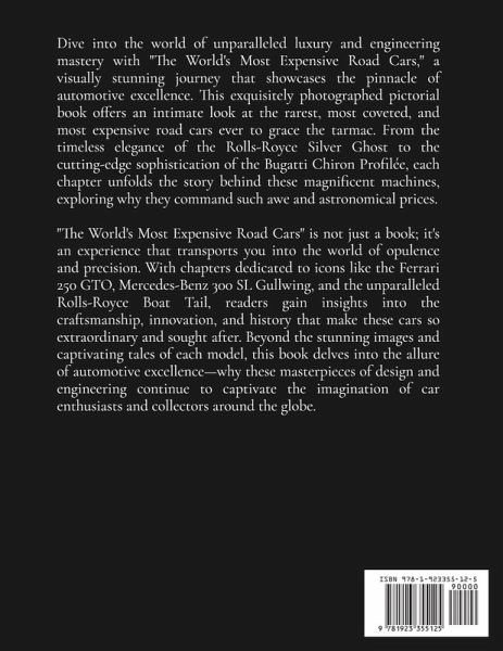 Dive into the world of unparalleled luxury and engineering mastery with "The World's Most Expensive Road Cars," a visually stunning journey that showcases the pinnacle of automotive excellence. This exquisitely photographed pictorial book offers an intimate look at the rarest, most coveted, and most expensive road cars ever to grace the tarmac. From the timeless elegance of the Rolls-Royce Silver Ghost to the cutting-edge sophistication of the Bugatti Chiron Profilée, each chapter unfolds the story behind these magnificent machines, exploring why they command such awe and astronomical prices. "The World's Most Expensive Road Cars" is not just a book; it's an experience that transports you into the world of opulence and precision. With chapters dedicated to icons like the Ferrari 250 GTO, Mercedes-Benz 300 SL Gullwing, and the unparalleled Rolls-Royce Boat Tail, readers gain insights into the craftsmanship, innovation, and history that make these cars so extraordinary and sought after. Beyond the stunning images and captivating tales of each model, this book delves into the allure of automotive excellence-why these masterpieces of design and engineering continue to captivate the imagination of car enthusiasts and collectors around the globe.