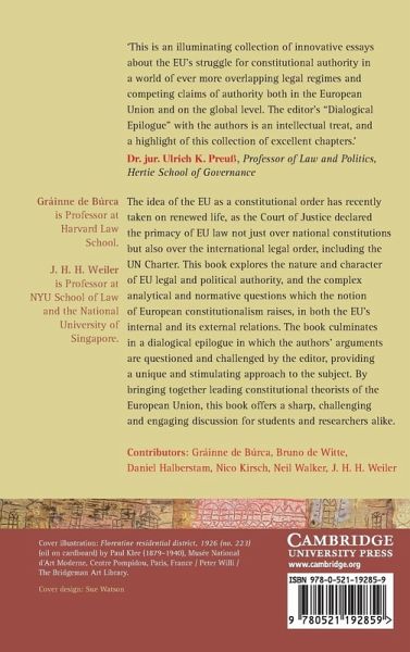 The idea of the EU as a constitutional order has recently taken on renewed life, as the Court of Justice declared the primacy of EU law not just over national constitutions but also over the international legal order, including the UN Charter. This book explores the nature and character of EU legal and political authority, and the complex analytical and normative questions which the notion of European constitutionalism raises, in both the EU's internal and its external relations. The book culminates in a dialogical epilogue in which the authors' arguments are questioned and challenged by the editor, providing a unique and stimulating approach to the subject. By bringing together leading constitutional theorists of the European Union, this book offers a sharp, challenging and engaging discussion for students and researchers alike.