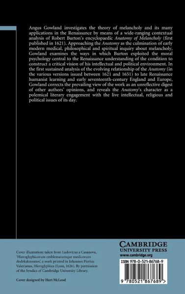 Angus Gowland investigates the theory of melancholy and its many applications in the Renaissance by means of a wide-ranging contextual analysis of Robert Burton's encyclopaedic Anatomy of Melancholy (first published in 1621). Approaching the Anatomy as the culmination of early modern medical, philosophical and spiritual inquiry about melancholy, Gowland examines the ways in which Burton exploited the moral psychology central to the Renaissance understanding of the condition to construct a critical vision of his intellectual and political environment. In the first sustained analysis of the evolving relationship of the Anatomy (in the various versions issued between 1621 and 1651) to late Renaissance humanist learning and early seventeenth-century England and Europe, Gowland corrects the prevailing view of the work as an unreflective digest of other authors' opinions, and reveals the Anatomy's character as a polemical literary engagement with the live intellectual, religious and political issues of its day.
