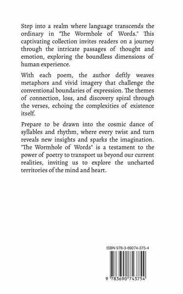 Step into a realm where language transcends the ordinary in "The Wormhole of Words." This captivating collection invites readers on a journey through the intricate passages of thought and emotion, exploring the boundless dimensions of human experience. With each poem, the author deftly weaves metaphors and vivid imagery that challenge the conventional boundaries of expression. The themes of connection, loss, and discovery spiral through the verses, echoing the complexities of existence itself. Prepare to be drawn into the cosmic dance of syllables and rhythm, where every twist and turn reveals new insights and sparks the imagination. "The Wormhole of Words" is a testament to the power of poetry to transport us beyond our current realities, inviting us to explore the uncharted territories of the mind and heart.