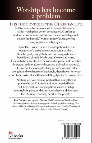 Worship has become a problem.It is the center of the Christian life, but like so much else in our kaleidoscopic late-modern world, worship has gotten complicated. Confusing. And even controversial. Church leaders and laypeople have joined the debate over "traditional," "contemporary" and a growing array of other worship styles.Pastor (and professor) Paul Basden believes worship should be the occasion of praise and celebration, not conflict. In this book he gently, insightfully and encouragingly leads all of us bewildered church folk through today's worship maze. First he carefully delineates five prominent approaches to worshipliturgical traditional revivalist praise seeker-sensitive Then he lays out the essential hallmarks of genuine worship (of any style), sifts out the strengths and weaknesses of each major style, and shows how churches can arrive at a faithful and fitting style for their own worship.Nothing we do is more important than our gathered praise of God. Basden's sensitive, positive, much-needed book will help confused congregations restore worship to its rightful place. And it will help churches who have yet to encounter conflict over worship to road-check and fine-tune their Sunday-morning "work of the people."