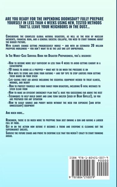 Are you ready for the impending Doomsday? Fully prepare yourself in less than 4 weeks using new, tested methods that'll leave your neighbors in the dust... Did you know that there were 980 global natural catastrophes in 2020, with three of the costliest events happening in the US? Hurricane Laura and the California wildfires are just two examples of the devastation that can occur naturally. Now, when you take into consideration the risk of nuclear incidents, financial ruin, or a general societal collapse, you need to start thinking about the big question: What then? If you are reading this, then you survived the COVID pandemic, but are you really prepared for another one? One that could even last years? With climate change getting progressively worse - and with an estimated 20 million preppers worldwide - you don't want to be the last one left unprepared. In The Worst-Case Survival Book for Disaster Preparedness, you'll discover: How to become more self-sufficient in less than 4 weeks to avoid getting caught in a catastrophe 10 things to avoid as a prepper - what not to do when the pressure is on New ways to store and cook your rations - and top tips to stop looters from getting their hands on your stash Life-saving first aid advice including the essential equipment needed to treat illness, wounds, and injury How to protect yourself and your family from disasters, including 6 fatal mistakes to steer clear from How to make an efficient emergency plan that'll have you succeeding far above the rest Techniques to help build short and long term shelter (used by Bear Grylls!), so you are prepared for any situation How to easily source and purify water without the need for expensive (and often unnecessary) equipment And much more... ¿¿Even if you feel confident in yourself right now, there's no room for mishaps when it truly matters. Remember, there is so much more to prepping than just owning a gun and having a larder full of food. Celebrities such as Zooey Deschanel, Steve Huffman, and Kanye West are all known preppers. Get in on the action now before it becomes a trend and everyone is cleaning out the supermarket shelves! If you want to survive the future chaos and prove to everyone else that you weren't crazy to start thinking ahead, then scroll up and click the "Add to Cart" button right now.