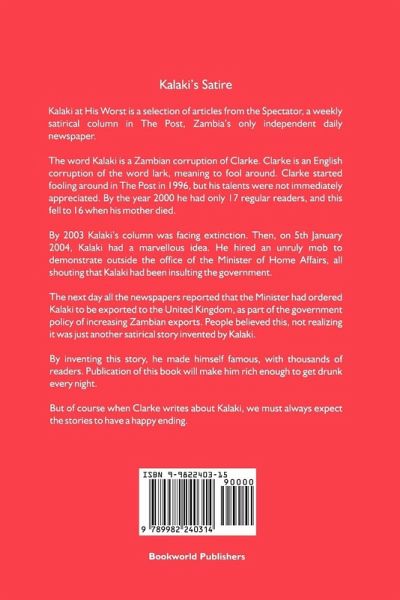 In 2004, it was widely reported in the British and Zambian press that Roy Clarke, columnist and satirist known as 'Kalaki', on the The Post, Zambia's major independent daily, faced deportation. Following a column entitled 'Mfuwe', the government had announced he was 'a threat to peace and good order'. Clarke refused to succumb however, or indeed apologise. Instead, supported by his editor, he continued to champion the freedom of the press in Zambia, freedom of expression in general and the cause of Zambian journalism. This book brings together a collection of Clarke's writings, published over a period of five years. His writings are characterised by irony, satire and caustic wit, exposing folly, vice and hypocrisy. They are accompanied by the political cartoons of Trevor Ford, popularly know as 'Yuss'. Fred M'Membe, editor of The Post, provides the introduction to the book, in which he comments: 'Nowadays we find ourselves stuck in a culture of zealous worship of leaders, a culture that would look primitive in the eyes of our ancestors. Our modern African societies have established a reputation for intolerance that is difficult to match....I see Roy's work as attempting to confront this situation, to help us return to our more tolerant Zambian culture; a culture of liberating, life-giving and enjoyable laughter!'