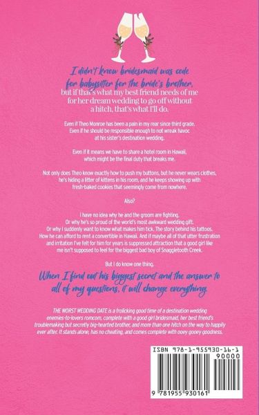 I didn't know bridesmaid was code for babysitter for the bride's brother, but if that's what my best friend needs of me for her dream wedding to go off without a hitch, that's what I'll do. Even if Theo Monroe has been a pain in my rear since third grade. Even if he should be responsible enough to not wreak havoc at his sister's destination wedding. Even if it means we have to share a hotel room in Hawaii, which might be the final duty that breaks me. Not only does Theo know exactly how to push my buttons, but he never wears clothes, he's hiding a litter of kittens in his room, and he keeps showing up with fresh-baked cookies that seemingly come from nowhere. Also? I have no idea why he's being such an utter ass to the groom. Or why he's so proud of the world's most awkward wedding gift. Or why I suddenly want to know what makes him tick. The story behind his tattoos. How he can afford to rent a convertible in Hawaii. And if maybe all of that utter frustration and irritation I've felt for him for years is suppressed attraction that a good girl like me isn't supposed to feel for the biggest bad boy of Snaggletooth Creek. But I do know one thing. When I find out his biggest secret and the answer to all of my questions, it will change everything. The Worst Wedding Date is a frolicking good time of a destination wedding enemies-to-lovers romcom, complete with a good girl bridesmaid, her best friend's troublemaking but secretly big-hearted brother, and more than one hitch on the way to happily ever after. It stands alone, has no cheating, and comes complete with ooey gooey goodness.