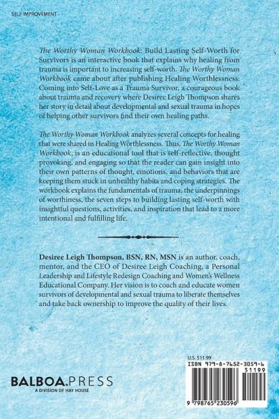 The Worthy Woman Workbook: Build Lasting Self-Worth for Survivors is an interactive book that explains why healing from trauma is important to increasing self-worth. The Worthy Woman Workbook came about after publishing Healing Worthlessness: Coming into Self-Love as a Trauma Survivor, a courageous book about trauma and recovery where Desiree Leigh Thompson shares her story in detail about developmental and sexual trauma in hopes of helping other survivors find their own healing paths. The Worthy Woman Workbook analyzes several concepts for healing that were shared in Healing Worthlessness. Thus, The Worthy Woman Workbook, is an educational tool that is self-reflective, thought provoking, and engaging so that the reader can gain insight into their own patterns of thought, emotions, and behaviors that are keeping them stuck in unhealthy habits and coping strategies. The workbook explains the fundamentals of trauma, the underpinnings of worthiness, the seven steps to building lasting self-worth with insightful questions, activities, and inspiration that lead to a more intentional and fulfilling life.