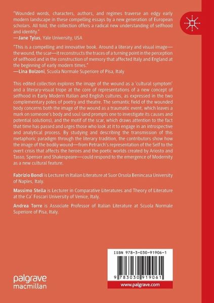 This edited collection explores the image of the wound as a 'cultural symptom' and a literary-visual trope at the core of representations of a new concept of selfhood in Early Modern Italian and English cultures, as expressed in the two complementary poles of poetry and theatre. The semantic field of the wounded body concerns both the image of the wound as a traumatic event, which leaves a mark on someone's body and soul (and prompts one to investigate its causes and potential solutions), and the motif of the scar, which draws attention to the fact that time has passed and urges those who look at it to engage in an introspective and analytical process. By studying and describing the transmission of this metaphoric paradigm through the literary tradition, the contributors show how the image of the bodily wound-from Petrarch's representation of the Self to the overt crisis that affects the heroes and the poetic worlds created by Ariosto and Tasso, Spenser and Shakespeare-could respond tothe emergence of Modernity as a new cultural feature.