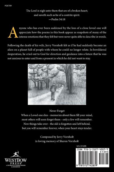 If you have ever experienced a deep sadness over the loss of a close loved one, you will recognize the poems in The Wounds of Grief as snapshots of many of the intense emotions that you felt but perhaps were never quite able to describe in words. Instead of allowing himself to be bullied into following society's schedule to "get over it" and to "move on," Jerry Vornholt has used his poems to warmly recall how many of the very ordinary events that he and his wife took for granted have now become some of his most precious memories. Jerry and his wife, Sharon, frequently referred to themselves as a team throughout the forty-eight years that they had the privilege to be together. Several of the poems in this book focus on his intense desire for that relationship to be continued in heaven.