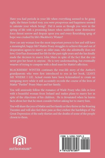 Have you had periods in your life when everything seemed to be going right, the future looked rosy, you were prosperous and happiness seemed to saturate your whole being? Did it seem as though you were in the spring of life with a promising future when suddenly some destructive force thrust sorrow and despair upon you and every flourishing sprig of hope was crushed by life's Blackberry Winter? How can any woman lose the most important person to her and still have a meaningful, happy life? Mattie Posey struggles to achieve this and out of desperation agrees to marry an older man, who she admittedly does not love. Grief has dominated her life for the past eight years and she has finally made the decision to marry John Mayo in spite of the fact that she can never give her heart to anyone. He is very understanding, but eventually wearies of trying to compete with a dead man for Mattie's affection. BLACKBERRY WINTER continues the true-life story of the Author's grandparents who were first introduced to you in her book, LEAVE ME WHERE I LIE. Actual events have been fictionalized to create an intriguing story while it still accurately records the course of the lives of Mattie "Parilee" Posey Mayo and her family. You will anxiously follow the romance of Wade Posey who falls in love with a beautiful woman from Ireland and makes plans to marry her in spite of the objections of his children. He is devastated when he learns facts about her that he must consider before asking her to marry him. You will share the joys of Mattie and her family as they thrive in the Roaring Twenties and will also feel their pain as they endure the hardships of The Great Depression of the early thirties and the deaths of some of the people closest to them.