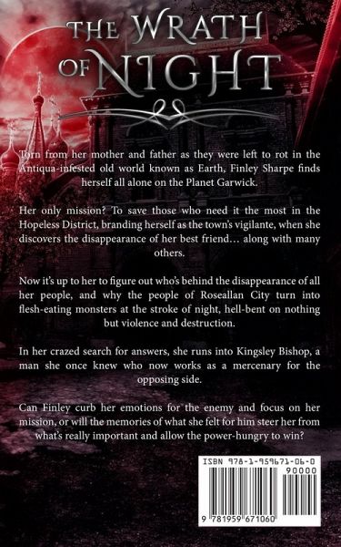 Torn from her mother and father as they were left to rot in the Antiqua-infested old world known as Earth, Finley Sharpe finds herself all alone on the Planet Garwick. Her only mission? To save those who need it the most in the Hopeless District, branding herself as the town's vigilante, when she discovers the disappearance of her best friend... along with many others. Now it's up to her to figure out who's behind the disappearance of all her people, and why the people of Roseallan City turn into flesh-eating monsters at the stroke of night, hell-bent on nothing but violence and destruction. In her crazed search for answers, she runs into Kingsley Bishop, a man she once knew who now works as a mercenary for the opposing side. Can Finley curb her emotions for the enemy and focus on her mission, or will the memories of what she felt for him steer her from what's really important and allow the power-hungry to win?