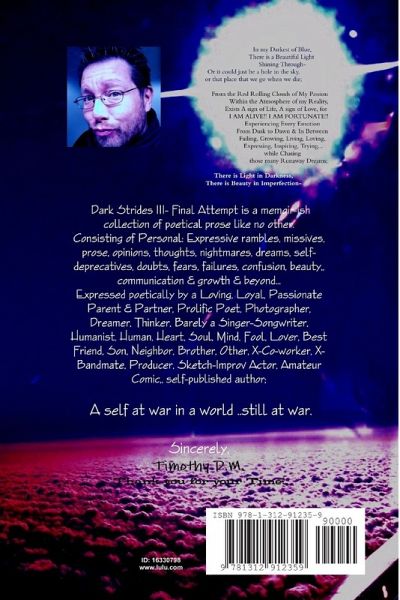 A collection of unique personal poetical prose regarding life, love, dreams, failures, opinions, emotions, doubts, fears, battles between me, myself & I, romance, issues, regression, progression, expression. This is Not just poetry. Not just words. Not just rhyme. What you will find within these pages is my heart, soul & mind...page by page, line by line.