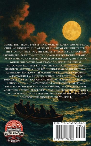 The Wreck of the Titan, or FutilityThe Book That Predicted the Titanic: Restored 1912 Facsimile with Annotations and Collector's Commentary (The Official Autograph Facsimile Edition(TM) Book 1) Discover the prophetic novel that eerily predicted the Titanic disaster-fourteen years before it happened. The Wreck of the Titan, or Futility by Morgan Robertson tells the gripping story of the Titan, an "unsinkable" ship that strikes an iceberg and sinks in the North Atlantic. This Official Autograph Facsimile Edition(TM) restores the rare 1912 text alongside a high-resolution scan of the original Autograph Edition, complete with Robertson's facsimile signature. More than just a reprint, this collector's edition features detailed annotations, a thought-provoking introduction, and a powerful afterword that connects Robertson's warnings to the modern world. This is the only edition that preserves the authentic 1912 facsimile while offering modern readers insights into the Titanic tragedy, maritime history, and the dangers of human hubris. Perfect for Titanic enthusiasts, history buffs, and collectors of rare editions, this volume stands apart from cheap reprints by offering an enriched, scholarly experience. Whether you're exploring maritime fiction or seeking a premium collectible, this annotated facsimile edition delivers unparalleled historical and literary value.