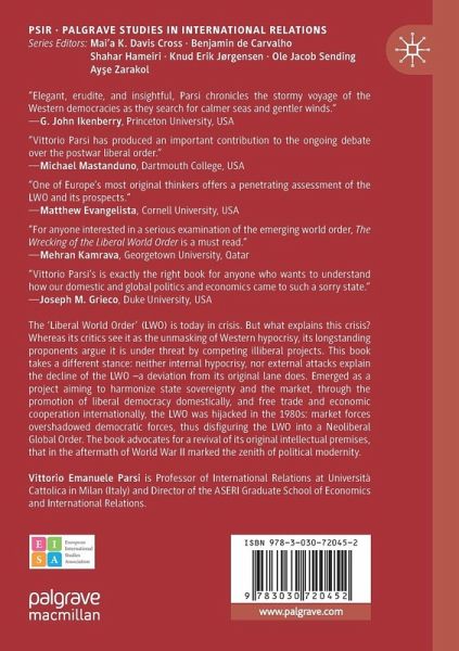 "Parsi's book, The Wrecking of the Liberal World Order, starts with 'The Liberal World Order and the Broken Pact Between Democracy and Market'. ... The Liberal World Order described by Parsi involved five pillars. ... In developing his theme, the book follows with several very well developed, in-depth chapters on the development ... . Subsequent chapters cover Parsi's four trends in admirable depth. ..." (Philip G. Cerny, European Review of International Studies ERIS, Issue 10, 2023)