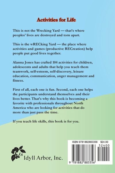This is the wRECking Yard - the place where activities and games (productive RECreation) help people put lives together. Alanna Jones has crafted 104 activities for groups of children, adolescents, adults, and older adults that help you teach them teamwork, self-esteem, self-discovery, leisure education, communication, anger management, and fitness. First of all, each one is fun. Second, each one helps the participants understand themselves and their lives better. That's why this book is a favorite with professionals throughout North America who work in everything from psych facilities to church groups. If you teach life skills to children, adolescents, or adults, this book is for you.