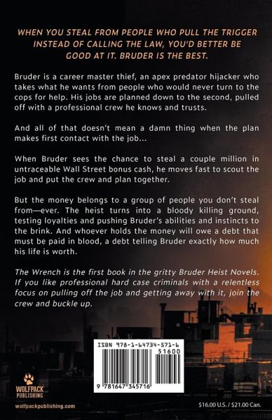 When you steal from people who pull the trigger instead of calling the law, you'd better be good at it. Bruder is the best. Bruder is a career master thief, an apex predator hijacker who takes what he wants from people who would never turn to the cops for help. His jobs are planned down to the second, pulled off with a professional crew he knows and trusts. And all of that doesn't mean a damn thing when the plan makes first contact with the job... When Bruder sees the chance to steal a couple million in untraceable Wall Street bonus cash, he moves fast to scout the job and put the crew and plan together. But the money belongs to a group of people you don't steal from-ever. The heist turns into a bloody killing ground, testing loyalties and pushing Bruder's abilities and instincts to the brink. And whoever holds the money will owe a debt that must be paid in blood, a debt telling Bruder exactly how much his life is worth. The Wrench is the first book in the gritty Bruder Heist Novels. If you like professional hard case criminals with a relentless focus on pulling off the job and getting away with it, join the crew and buckle up.
