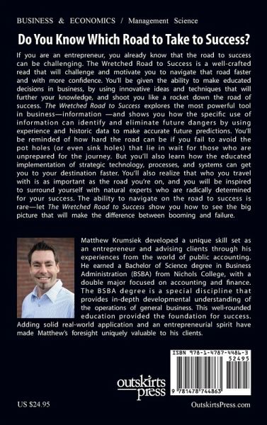 The Wretched Road to Success: A Book on Business & Management Theories The road to success can be rocky, but it is navigable. The Wretched Road to Success by Matthew Krumsiek serves as a valuable resource for entrepreneurs and everyone from small business owners to high-power corporate executives in their mission to negotiate that long and often arduous journey. In fact, with the actionable tools in this book, yoüll make your way down that road faster, easier and with greater confidence than ever before! Consider this book your stepping stone to a solid foundation in business theory. With the information provided in The Wretched Road to Success, yoüll be empowered to make educated business decisions that will further your entrepreneurial success. Yoüll avoid the common traps that have ensnared so many failed entrepreneurs before you, while recognizing and capitalizing on valuable opportunities as they arise. The Wretched Road to Success provides a different perspective on cost/benefit analysis point as it relates to making savvy business decisions. Far from a dry, boring tome, this book offers a quick, understandable read that will quickly put you on the road to business success.