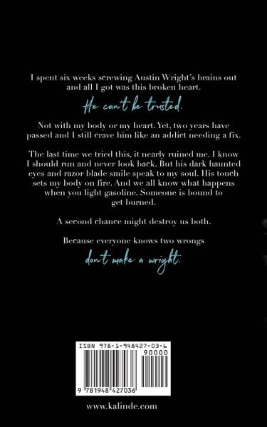 A new stand alone enemies-to-lovers romance by USA Today bestselling author K.A. Linde... I spent six weeks screwing Austin Wright's brains out and all I got was this broken heart. He can't be trusted. Not with my body or my heart. Yet, two years have passed and I still crave him like an addict needing a fix. The last time we tried this, it nearly ruined me. I know I should run and never look back. But his dark haunted eyes and razor blade smile speak to my soul. His touch sets my body on fire. And we all know what happens when you light gasoline. Someone is bound to get burned. A second chance might destroy us both. Because everyone knows two wrongs don't make a Wright.