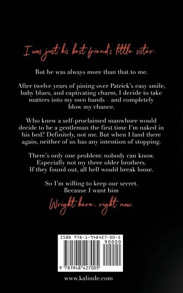 A new brother's-best-friend stand alone romance by USA Today bestselling author K.A. Linde... I was just his best friend's little sister. But he was always more than that to me. After twelve years of pining over Patrick's easy smile, baby blues, and captivating charm, I decide to take matters into my own hands--and completely blow my chance. Who knew a self-proclaimed manwhore would decide to be a gentleman the first time I'm naked in his bed? Definitely, not me. But when I land there again, neither of us has any intention of stopping. There's only one problem: nobody can know. Especially not my three older brothers. If they found out, all hell would break loose. So I'm willing to keep our secret... Because I want him Wright here, right now.