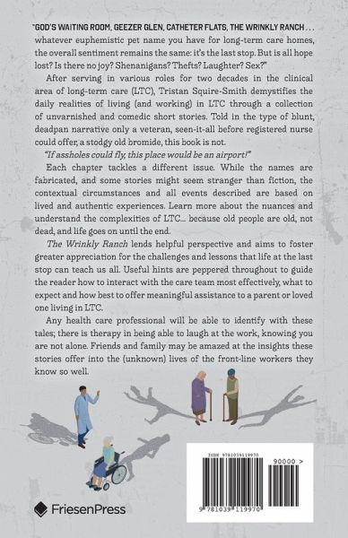 "God's Waiting Room, Geezer Glen, Catheter Flats, the Wrinkly Ranch . . . whatever euphemistic pet name you have for long-term care homes, the overall sentiment remains the same: it's the last stop. But is all hope lost? Is there no joy? Shenanigans? Thefts? Laughter? Sex?" After serving in various roles for two decades in the clinical area of long-term care (LTC), Tristan Squire-Smith demystifies the daily realities of living (and working) in LTC through a collection of unvarnished and comedic short stories. Told in the type of blunt, dead-pan, narrative only a veteran, seen-it-all-before, registered nurse could offer, a stodgy old bromide, this book is not. "If assholes could fly, this place would be an airport!" Each chapter tackles a different issue. While the names are fabricated, and some stories might seem stranger than fiction, the contextual circumstances and all events described are based on lived and authentic experiences. Learn more about the nuances and understand the complexities of LTC... because old people are old, not dead, and life goes on until the end. The Wrinkly Ranch lends helpful perspective and aims to foster greater appreciation for the challenges and lessons that life at the last stop can teach us all. Useful hints are peppered throughout to guide the reader how to interact with the care team most effectively, what to expect and how best to offer meaningful assistance to a parent or loved one living in LTC. Any health care professional will be able to identify with these tales; there is therapy in being able to laugh at the work, knowing you are not alone. Friends and family may be amazed at the insights these stories offer into the (unknown) lives of the front-line workers they know so well.