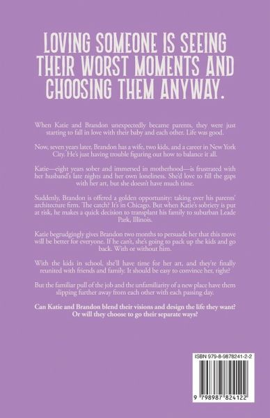 Loving someone is seeing their worst moments and choosing them anyway. When Katie and Brandon unexpectedly became parents, they were just starting to fall in love with their baby and each other. Life was good.Now, seven years later, Brandon has a wife, two kids, and a career in New York City. He's just having trouble figuring out how to balance it all. Katie-eight years sober and immersed in motherhood-is frustrated with her husband's late nights and her own loneliness. She'd love to fill the gaps with her art, but she doesn't have much time. Suddenly, Brandon is offered a golden opportunity: taking over his parents' architecture firm. The catch? It's in Chicago. But when Katie's sobriety is put at risk, he makes a quick decision to transplant his family to suburban Leade Park, Illinois. Katie begrudgingly gives Brandon two months to persuade her that this move will be better for everyone. If he can't, she's going to pack up the kids and go back. With or without him. With the kids in school, she'll have time for her art, and they're finally reunited with friends and family. It should be easy to convince her, right? But the familiar pull of the job and the unfamiliarity of a new place have them slipping further away from each other with each passing day. Can Katie and Brandon blend their visions and design the life they want? Or will they choose to go their separate ways?
