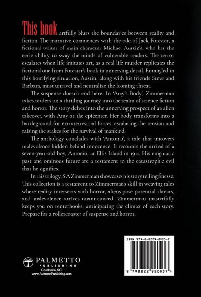 Horror meets reality as author Michael Austin, entangled in a sinister murder plucked from his own novel, races to halt a mind-controlling menace. Plus, discover alien risks in Amy's Body and the mystery of Antonio, a boy harbinger of evil. The book opens with a tale about a renowned author, Jack Forester, whose writing possesses the power to manipulate the minds of his susceptible readers. The plot takes a terrifying twist when a real-life murder mirrors the grisly killing described in Forester's book, leaving the main character Michael Austin and his friends, Steve and Barbara, in a race against time to thwart the looming danger. While still reeling from the unfolding horror, readers are catapulted into the world of 'Amy's Body.' This story is a riveting blend of science fiction and horror, exploring the terrifying possibility of an alien invasion. Amy becomes the focal point of this narrative, her body serving as the battlefield for an intergalactic power struggle. The suspense is palpable, the stakes high as humanity's future hangs in the balance. The final tale, 'Antonio, ' unveils a sinister evil lurking in the most innocent guise. The story begins in 1911 with the arrival of a seven-year-old boy at Ellis Island. His past is shrouded in mystery, his future poised to unleash a wave of terror. This narrative is a chilling examination of the embodiment of evil and its potential to wreak havoc on the world.