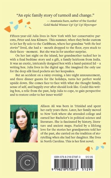 "An epic family story of turmoil and change." - ANASTASIA SUEN, author of the Eureka! Gold Medal Winner Up! Up! Up! Skyscraper Fifteen-year old Julia lives in New York with her conservative parents, Peter and Ana Kilmere. Each summer she spends visiting her grandmother who lives on a Caribbean island. Holidays at grandma's is the best for Julia. She loves the beach, grandma's cooking and best of all her stories. There's also a little something going on with her childhood friend, Jonathan. On her last night on the island, her grandmother tucks her in with an exotic gift that comes with a story. It's a family heirloom from India, a writing box. Julia lives in the digital age and can't imagine any use for it except to hold her trinkets. But an accident on a rainy evening, a late-night announcement, and three dinner guests shatters her ideas of her perfect world. She comes face-to-face with how she thought family, sense of self and happily ever after should look like. Could her grandmother's gift, a relic from the past, help put Julia back together again?