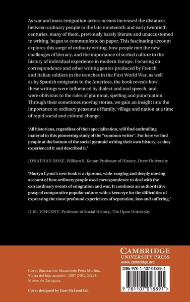 As war and mass emigration across oceans increased the distances between ordinary people in the late nineteenth and early twentieth centuries, many of them, previously barely literate and unaccustomed to writing, began to communicate on paper. This fascinating account explores this surge of ordinary writing, how people met the new challenges of literacy and the importance of scribal culture to the history of individual experience in modern Europe. Focusing on correspondence and other writing genres produced by French and Italian soldiers in the trenches in the First World War, as well as Spanish emigrants to the Americas, the book reveals how these writings were influenced by dialect and oral speech and were oblivious to the rules of grammar, spelling and punctuation. Through their sometimes moving stories, we gain an insight into the importance to ordinary peasants of family, village and nation at a time of rapid social and cultural change.