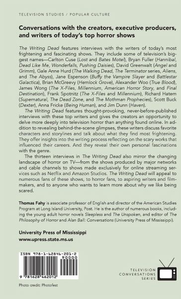 The Writing Dead: Talking Terror with TV's Top Horror Writers features interviews with the writers of today's most frightening and fascinating shows. They include some of TV's biggest names-Carlton Cuse (Lost and Bates Motel), Bryan Fuller (Hannibal, Dead Like Me, Wonderfalls, Pushing Daisies), David Greenwalt (Angel and Grimm), Gale Anne Hurd (The Walking Dead, The Terminator series, Aliens, and The Abyss), Jane Espenson (Buffy the Vampire Slayer and Battlestar Galactica), Brian McGreevy (Hemlock Grove), Alexander Woo (True Blood), James Wong (The X-Files, Millennium, American Horror Story, and Final Destination), Frank Spotnitz (The X-Files and Millennium), Richard Hatem (Supernatural, Grimm, The Dead Zone, and The Mothman Prophecies), Scott Buck (Dexter), Anna Fricke (Being Human), and Jim Dunn (Haven). The Writing Dead features thought-provoking, original interviews with these top writers and gives them the opportunity to delve deeper into horror TV than anything found online. In addition to revealing behind-the-scene glimpses into these shows, these writers discuss favorite characters and story lines. They talk about the things they find most frightening to write about. They offer insights into the writing process. They reflect on the horror works that influenced their careers. And they reveal their own personal fascination with the genre. The thirteen interviews in The Writing Dead also reflect the changing landscape of horror TV-from the shows being produced by major networks and cable channels to shows made exclusively for online streaming services such as Netflix and Amazon Studios. The Writing Dead will appeal to numerous rabid fans of these shows (many of whom spend countless hours blogging about their favorite show), to horror fans everywhere, to aspiring writers and filmmakers, and to anyone who wants to learn more about why we like being scared.