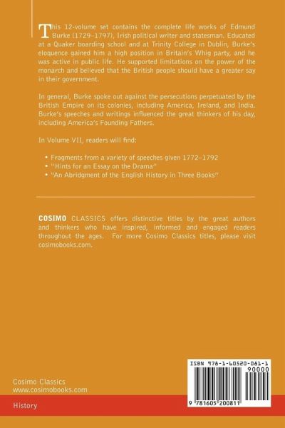 This 12-volume set contains the complete life works of EDMUND BURKE (1729-1797), Irish political writer and statesman. Educated at a Quaker boarding school and at Trinity College in Dublin, Burke's eloquence gained him a high position in Britain's Whig party, and he was active in public life. He supported limitations on the power of the monarch and believed that the British people should have a greater say in their government. In general, Burke spoke out against the persecutions perpetuated by the British Empire on its colonies, including America, Ireland, and India. Burke's speeches and writings influenced the great thinkers of his day, including America's Founding Fathers. In Volume VII, readers will find: . Fragments from a variety of speeches given 1772-1792 . "Hints for an Essay on the Drama" . "An Abridgment of the English History in Three Books"