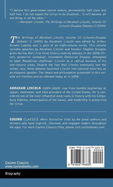 "I believe this government cannot endure, permanently, half slave and half free. I do not expect the Union to be dissolved... It will become all one thing, or all the other." -Abraham Lincoln, The Writings of Abraham Lincoln, Volume III (Lincoln-Douglas Debates I) (1905) The Writings of Abraham Lincoln, Volume III (Lincoln-Douglas Debates I) (1905) by Abraham Lincoln was edited by Arthur Brooks Lapsley and is part of an eight-volume series. This volume includes speeches by Abraham Lincoln and Senator Stephen Douglas given during their first three history-making debates in the 1858 Illinois senatorial campaign. Incumbent Democrat Douglas attempted to label Republican challenger Lincoln as a radical because of his anti-slavery views. Despite the fact that Lincoln eventually lost the senate race, these debates launched Lincoln into national notoriety as an eloquent speaker. The ideals and philosophies presented in this volume are timeless and as relevant today as in 1858.