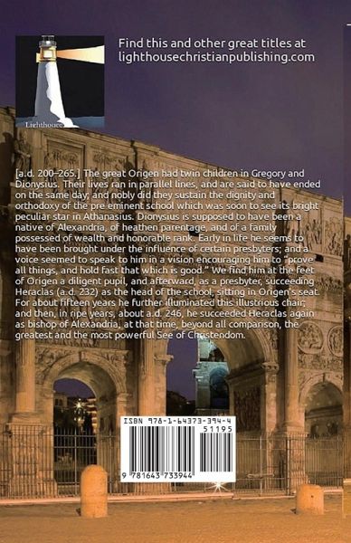 [a.d. 200-265.] The great Origen had twin children in Gregory and Dionysius. Their lives ran in parallel lines, and are said to have ended on the same day; and nobly did they sustain the dignity and orthodoxy of the pre-eminent school which was soon to see its bright peculiar star in Athanasius. Dionysius is supposed to have been a native of Alexandria, of heathen parentage, and of a family possessed of wealth and honourable rank. Early in life he seems to have been brought under the influence of certain presbyters; and a voice seemed to speak to him in a vision607 encouraging him to "prove all things, and hold fast that which is good." We find him at the feet of Origen a diligent pupil, and afterwards, as a presbyter, succeeding Heraclas (a.d. 232) as the head of the school, sitting in Origen's seat. For about fifteen years he further illuminated this illustrious chair; and then, in ripe years, about a.d. 246, he succeeded Heraclas again as bishop of Alexandria, at that time, beyond all comparison, the greatest and the most powerful See of Christendom.
