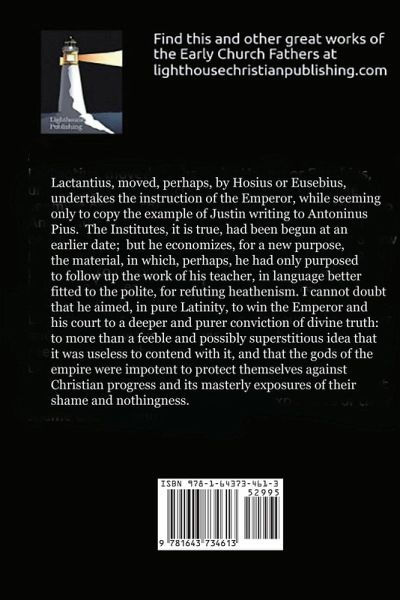 The Writings of Lactantius including the Divine Institutes Lactantius, moved, perhaps, by Hosius or Eusebius, undertakes the instruction of the Emperor, while seeming only to copy the example of Justin writing to Antoninus Pius. The Institutes, it is true, had been begun at an earlier date; but he economizes, for a new purpose, the material, in which, perhaps, he had only purposed to follow up the work of his teacher, in language better fitted to the polite, for refuting heathenism. I cannot doubt that he aimed, in pure Latinity, to win the Emperor and his court to a deeper and purer conviction of divine truth: to more than a feeble and possibly superstitious idea that it was useless to contend with it, and that the gods of the empire were impotent to protect themselves against Christian progress and its masterly exposures of their shame and nothingness.