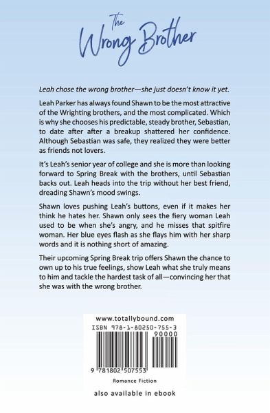 Leah chose the wrong brother-she just doesn't know it yet. Leah Parker has always found Shawn to be the most attractive of the Wrighting brothers, and the most complicated. Which is why she chooses his predictable, steady brother, Sebastian, to date after an ex leaves her confidence shattered and reputation ruined. While Sebastian is the perfect option to ease back into the dating pool, they make better friends than lovers and part amicably. It's Leah's senior year of college and she is more than looking forward to Spring Break with the brothers, until Sebastian backs out. Now she has to face the trip single and without her best friend. Shawn's yo-yo mood swings-sweet one minute and grumpy the next-make her even more apprehensive, despite Sebastian's reassurances that Shawn will look out for her. Shawn loves pushing Leah's buttons, even if it makes her think he hates her. Her angry responses to him are the only times he glimpses the fiery woman she used to be before her jerk of an ex-boyfriend got a hold of her. He misses that spitfire woman. The way her blue eyes flash when she's mad and how she flays him with her sharp words is nothing short of amazing. But things get complicated when he's forced to face his tangled mess of emotions head-on. Their upcoming Spring Break trip offers Shawn the chance to own up to his true feelings, show Leah what she truly means to him and tackle the hardest task of all-convincing her that she was with the wrong brother.