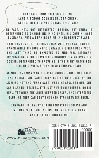 If you love friends to lovers, where opposites attract and Mr. Wrong is actually Mr. Right, then this is your next one-click! Graduate from college? Check. Land a school counselor job? Check. Seduce her forever crush? Epic fail! In fact, he's not interested, period. But Emma is determined to change his mind until his cousin, Gabe Buchanan, puts a definite crimp in her perfect plans. Gabe has come to help his cousin with work around the ranch while struggling to unravel his next book plot. The last thing he expected to find was literary inspiration in the curvaceous cowgirl pining over his cousin. Determined to prove he is the right match for her, he devises a plan to win Emma's heart. As much as Emma wants her childhood crush to finally take notice, she can't help but be intrigued by the sizzling hot and funny Gabe. When he asks her out, she can't say no. Besides, it's just a friendly dinner. No big deal. Yet when the lines between casual and interested blur, neither can deny the chemistry between them. Can Gabe fill every box on Emma's checklist and give her what she needs the most? His heart and a future together? Granite Junction is a spin-off from the Redemption Ranch series, with some of your favorite characters returning and making guest appearances, while others find their happy ever afters!