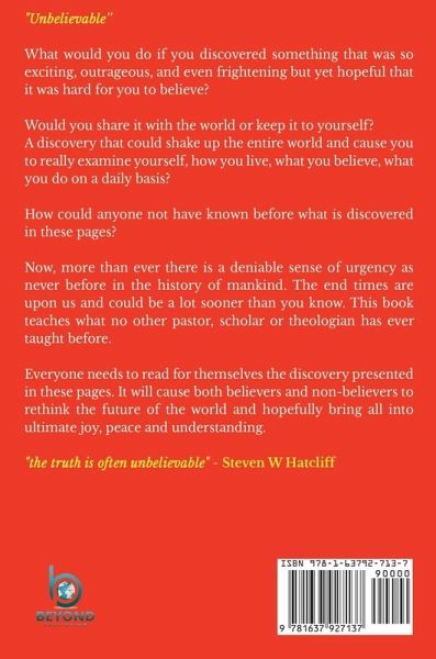 "Unbelievable'' What would you do if you discovered something that was so exciting, outrageous, and even frightening but yet hopeful that it was hard for you to believe? Would you share it with the world or keep it to yourself? A discovery that could shake up the entire world and cause you to really examine yourself, how you live, what you believe, what you do on a daily basis? How could anyone not have known before what is discovered in these pages? Now, more than ever there is a deniable sense of urgency as never before in the history of mankind. The end times are upon us and could be a lot sooner than you know. This book teaches what no other pastor, scholar or theologian has ever taught before. Everyone needs to read for themselves the discovery presented in these pages. It will cause both believers and non-believers to rethink the future of the world and hopefully bring all into ultimate joy, peace and understanding. "the truth is often unbelievable" - Steven W Hatcliff