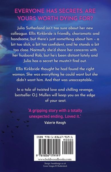 The BRAND NEW psychological thriller from O.J. Mullen Everyone has secrets. Are yours worth dying for? Julia Sutherland isn't too sure about her new colleague. Ellis Kirkbride is friendly, charismatic and handsome, but there's just something about him - a bit too slick, a bit too confident, and he stands a bit too close. Normally she'd share her concerns with her husband Rob, but he's been distant lately and Julia has a secret he mustn't find out. Ellis Kirkbride thought he had found the right woman. She was everything he could want but she didn't want him. And that was unacceptable... In a tale of twisted love and chilling revenge, bestseller O.J. Mullen will keep you on the edge of your seat until the very last page. Perfect for fans of K. L Slater, Claire Douglas and Sue Watson. Praise for O.J. Mullen: 'A brilliant story from a masterful storyteller.' Anita Waller 'A superb rollercoaster of a read. Gripping to the very last page!' J.A. Baker 'A gripping story with a totally unexpected ending. Loved it.' Valerie Keogh What readers are saying about O.J. Mullen: 'Mullen certainly knows his craft and effortlessly gives you intriguing characters and stories.. I never tire of his work. I can't really tell you how good this book is without giving more spoilers, but rest assured you won't be disappointed!' 'I haven't enjoyed a book like this for ages, the endings are usually very lame but this book was brilliantly written and had a proper ending... would 100% recommend haven't read this author's books before but can't wait to read more.' 'As the story twists and turns in parts Owen Mullen really takes your breath away ... Grief, lies secrets and sin. 5 stars... Absolutely stunning writing.' 'This is one hell of a rollercoaster!!! I was gripped from the first page of this book... It's full of many emotions as the characters are so well written you can relate to them all. It's quite gritty and tense and many twists and turns... but the finale Didn't see that coming. Another excellent book from this talented author.'
