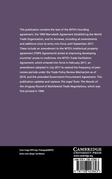 This publication contains the text of the WTO's founding agreement, the 1994 Marrakesh Agreement Establishing the World Trade Organization, and its Annexes, including all amendments and additions since its entry into force until September 2017. These include an amendment to the WTO's intellectual property agreement (TRIPS Agreement) aimed at improving developing countries' access to medicines, the WTO's Trade Facilitation Agreement, which entered into force in February 2017, an amendment adopted in July 2017 to extend the frequency of peer review periods under the Trade Policy Review Mechanism as of 2019, and the amended Government Procurement Agreement. This publication updates and replaces The Legal Texts: The Results of the Uruguay Round of Multilateral Trade Negotiations, which was first printed in 1994.