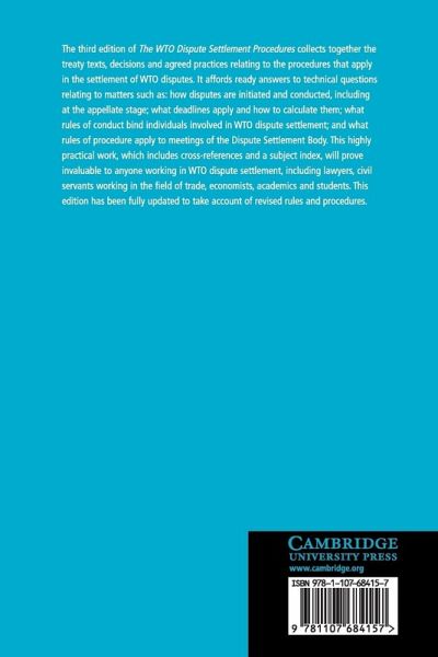 The third edition of The WTO Dispute Settlement Procedures collects together the treaty texts, decisions and agreed practices relating to the procedures that apply in the settlement of WTO disputes. It affords ready answers to technical questions relating to matters such as: how disputes are initiated and conducted, including at the appellate stage; what deadlines apply and how to calculate them; what rules of conduct bind individuals involved in WTO dispute settlement; and what rules of procedure apply to meetings of the Dispute Settlement Body. This highly practical work, which includes cross-references and a subject index, will prove invaluable to anyone working in WTO dispute settlement, including lawyers, civil servants working in the field of trade, economists, academics and students. This edition has been fully updated to take account of revised rules and procedures.