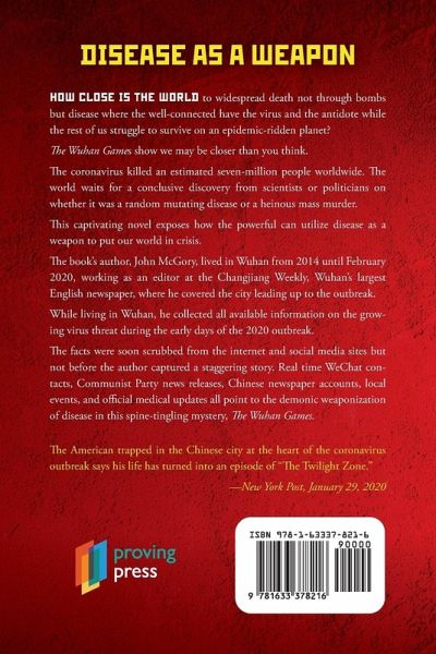 How close is the world to widespread death not through bombs but disease where the well-connected have the virus and the antidote while the rest of us struggle to survive on an epidemic-ridden planet? The Wuhan Games show we may be closer than you think. The coronavirus killed an estimated seven million people worldwide. The world waits for a conclusive discovery from scientists or politicians on whether it was a random mutating disease or a heinous mass murder. This captivating novel exposes how the powerful can utilize disease as a weapon to put our world in crisis. The book's author, John McGory, lived in Wuhan from 2014 until February 2020, working as an editor at the Changjiang Weekly, Wuhan's largest English newspaper, where he covered the city leading up to the outbreak. While living in Wuhan, he collected all available information on the growing virus threat during the early days of the 2020 outbreak. The facts were soon scrubbed from the internet and social media sites but not before the author captured a staggering story. Real-time WeChat contacts, Communist Party news releases, Chinese newspaper accounts, local events, and official medical updates all point to the demonic weaponization of disease in this spine-tingling mystery, The Wuhan Games.