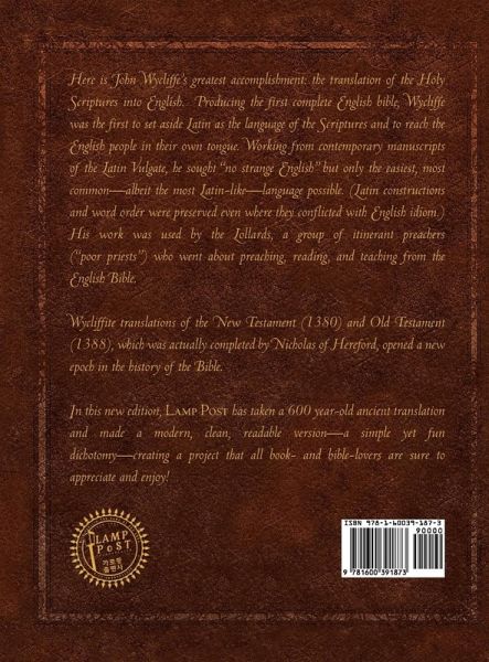 Here is John Wycliffe's greatest accomplishment: the translation of the Holy Scriptures into MIddle English. Producing the first complete English Bible, Wycliffe was the first to set aside Latin as the language of the Scriptures and reach the English people in their own tongue. Working from contemporary manuscripts of the Latin Vulgate, he sought "no strange English," but only the easiest, most common - albeit the most Latin-like language possible. (Latin constructions and word order were preserved even where they conflicted with English idiom.) His work was used by the Lollards, a group of itinerant preachers ("poor priests") who went about preaching, reading, and teaching from this new English Bible. Wycliffite translations of the New Testament (1380) and Old Testament (1388), which was actually completed by Nicholas of Hereford, opened a new epoch in the history of the Bible. After the inital translation was completed, John Purvey reworked the text again for greater 14th Century-contemporary readability and clarity. In this new edition, with over 50 images, LAMP POST has taken a 600-year-old ancient translation and made a modern, clean, readable version - a simple yet fun dichotomy - creating a project that all book- and Bible-lovers are sure to appreciate and enjoy!