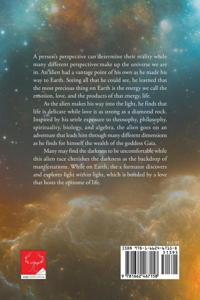 A person's perspective can determine their reality while many different perspectives make up the universe we are in. An alien had a vantage point of his own as he made his way to Earth. Seeing all that he could see, he learned that the most precious thing on Earth is the energy we call the emotion, love, and the products of that energy, life. As the alien makes his way into the light, he finds that life is delicate while love is as strong as a diamond rock. Inspired by his settle exposure to theosophy, philosophy, spirituality, biology, and algebra, the alien goes on an adventure that leads him through many different dimensions as he finds for himself the wealth of the goddess Gaia. Many may find the darkness to be uncomfortable while this alien race cherishes the darkness as the backdrop of manifestations. While on Earth, the x formator discovers and explores light within light, which is bonded by a love that hosts the epitome of life.