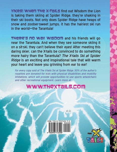 Yikes! When the X-tails find out Wisdom the Lion is taking them skiing at Spider Ridge, they're shaking in their ski boots. Not only does Spider Ridge have heaps of snow and zoober-sweet jumps, it has the hairiest ski run in the world- the Tarantula! There's no way Wisdom and his friends will go near the Tarantula. And when they see someone skiing it on a sit-ski, they can't believe their eyes! After meeting this daring skier, can the X-tails be convinced to do something more hairy than the Tarantula? The X-tails Ski at Spider Ridge is an exciting and inspirational tale that will warm your heart and leave you grinning from ear to ear! With a message about inclusion, this is a wonderful story for children of all ages! For every copy sold of The X-tails Ski at Spider Ridge, 50% of the author's royalties are donated for kids with physical disabilities and mobility limitations, which will provide opportunities to use sports wheelchairs and other recreational equipment.