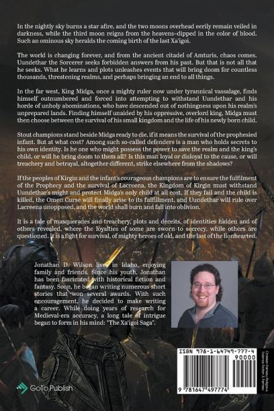 In the nightly sky burns a star afire, and the two moons overhead eerily remain veiled in darkness, while the third moon reigns from the heavens-dipped in the color of blood. Such an ominous sky heralds the coming birth of the last Xa'igoi. The world is changing forever, and from the ancient citadel of Amturis, chaos comes. Uundethar the Sorcerer seeks forbidden answers from his past. But that is not all that he seeks. What he learns and plots unleashes events that will bring doom for countless thousands, threatening realms, and perhaps bringing an end to all things. In the far west, King Midga, once a mighty ruler now under tyrannical vassalage, finds himself outnumbered and forced into attempting to withstand Uundethar and his horde of unholy abominations, who have descended out of nothingness upon his realm's unprepared lands. Finding himself unaided by his oppressive, overlord king, Midga must then choose between the survival of his small kingdom and the life of his newly born child. Stout champions stand beside Midga ready to die, if it means the survival of the prophesied infant. But at what cost? Among such so-called defenders is a man who holds secrets to his own identity. Is he one who might possess the power to save the realm and the king's child, or will he bring doom to them all? Is this man loyal or disloyal to the cause, or will treachery and betrayal, altogether different, strike elsewhere from the shadows? If the peoples of Kirgin and the infant's courageous champions are to ensure the fulfillment of the Prophecy and the survival of Lacreena, the Kingdom of Kirgin must withstand Uundethar's might and protect Midga's only child at all costs. If they fail and the child is killed, the Omen Curse will finally arise to its fulfillment, and Uundethar will rule over Lacreena unopposed, and the world shall burn and fall into oblivion. It is a tale of masquerades and treachery, plots and deceits, of identities hidden and of others revealed, where the loyalties of some are sworn to secrecy, while others are questioned. It is a fight for survival, of mighty heroes of old, and the last of the lionhearted.