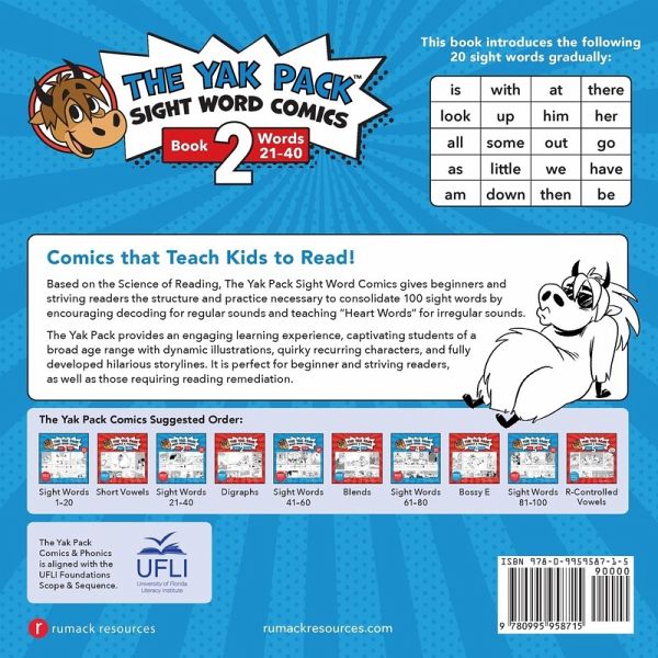 Based on Science of Reading research, The Yak Pack Comics is a series of beginner readers that builds foundational literacy skills in students of a broad age range and abilities. The entire series includes five phonics comic books and five sight word comic books. These decodable beginner readers can be used as a stand-alone program or with other research-based programs (Tier 1, 2, 3) and are ideal for K-2 students, special education students, and English Language Learners. Each story is a complete lesson targeting the five pillars of reading (phonemic awareness, phonics, fluency, vocabulary, and comprehension) while facilitating daily lesson planning. The Yak Pack provides a thorough and engaging learning experience, captivating students with dynamic graphics, quirky recurring characters, and fully developed hilarious storylines. With over 25 years of early literacy teaching experience, our educators have developed these books to be the ultimate no-tears early reading program for the classroom and at home. Look for more must-have Yak Pack comic books on Amazon and companion resources on the Rumack Resources website. Also, visit our website for a FREE sample of The Yak Pack Comics. Watch our video on our Amazon publisher page for more details. The Yak Pack Comics is printed by Kindle Direct Publishing. In the odd chance that you receive a misprint, please contact Amazon for a prompt exchange. This book is part of the Sight Words series: Book 2 of 5 - Dolch Sight Words 21 to 40 The first book in the series features 10 easy-to-read stories that teach the second list of 20 sight words:Story 11: is, with Story 12: at, there Story 13:look, up Story 14: him, her Story 15: all, some Story 16: out, go Story 17: as, little Story 18: we, have Story 19: am, down Story 20: then, be *** The Yak Pack Sight Word Comics series is most effective when all five books in the series are taught in sequence.