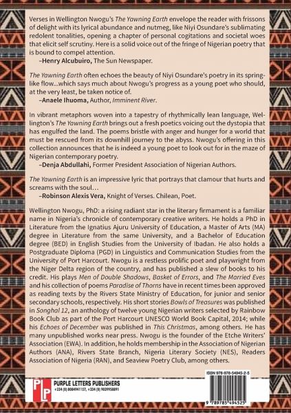 Verses in Wellington Nwogu's The Yawning Earth envelope the reader with frissons of delight with its lyrical abundance and nutmeg, like Niyi Osundare's sublimating redolent tonalities, opening a chapter of personal cogitations and societal woes that elicit self scrutiny. Here is a solid voice out of the fringe of Nigerian poetry that is bound to compel attention. -Henry Alcubuiro, The Sun Newspaper. The Yawning Earth often echoes the beauty of Niyi Osundare's poetry in its springlike flow...which says much about Nwogu's progress as a young poet who should, at the very least, be taken notice of. -Anaele Ihuoma, Author, Imminent River. In vibrant metaphors woven into a tapestry of rhythmically lean language, Wellington's The Yawning Earth brings out a fresh poetics voicing out the dystopia that has engulfed the land. The poems bristle with anger and hunger for a world that must be rescued from its downhill journey to the abyss. Nwogu's offering in this collection announces that he is indeed a young poet to look out for in the maze of Nigerian contemporary poetry. -Denja Abdullahi, Former President Association of Nigerian Authors. The Yawning Earth is an impressive lyric that portrays that clamour that hurts and screams with the soul... -Robinson Alexis Vera, Knight of Verses. Chilean, Poet.