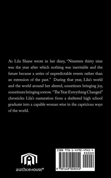 As Lila Shane wrote in her diary, "Nineteen thirty nine was the year after which nothing was inevitable and the future became a series of unpredictable events rather than an extension of the past." During that year, Lila's world and the world around her altered, sometimes bringing joy, sometimes bringing sorrow. "The Year Everything Changes" chronicles Lila's maturation from a sheltered high school graduate into a capable woman wise in the capricious ways of the world.