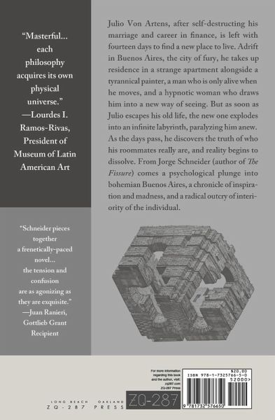 Julio Von Artens, after self-destructing his marriage and career in finance, is left with fourteen days to find a new place to live. Adrift in Buenos Aires, the city of fury, he takes up residence in a strange apartment alongside a tyrannical painter, a man who is only alive when he moves, and a hypnotic woman who draws him into a new way of seeing. But as soon as Julio escapes his old life, the new one explodes into an infinite labyrinth, paralyzing him anew. As the days pass, he discovers the truth of who his roommates really are, and reality begins to dissolve. From Jorge Schneider (author of The Fissure) comes a psychological plunge into bohemian Buenos Aires, a chronicle of inspiration and madness, and a radical outcry of interiority of the individual.