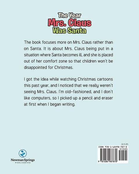 The book focuses more on Mrs. Claus rather than on Santa. It is about Mrs. Claus being put in a situation where Santa becomes ill, and she is placed out of her comfort zone so that children won't be disappointed for Christmas. I got the idea while watching Christmas cartoons this past year, and I noticed that we really weren't seeing Mrs. Claus. I'm old-fashioned, and I don't like computers, so I picked up a pencil and eraser at first when I began writing.